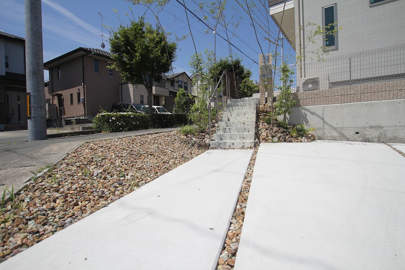 外構エクステリアでコストが掛かるのは、土留めや塀など工作物を造る工事になります。道路と敷地内に高低差がある場合はどうしても土留めを施工しないとおさまらないケースが出てきます。そのコストが掛かる土留めを極力無くし景観を考えて植栽をなるべく多く配置できるようにプランを組立てました。アプローチは建物に対して直角ではなく斜めに少し振ることで三角のスペースが生まれます。アプローチを挟んで互い違いに出来たスペースに植栽を施せば雑木のトンネルができます。枝葉が風に揺られ大谷石に木陰が映る風景は心地良く癒されます。