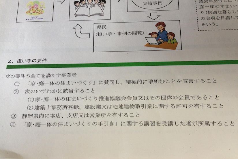 でも、担い手として登録出来る業者の条件としては、写真のようで、ぼくは、二級建築士はありますが建築士事務所登録はしてませんし、他の項目でも該当するところはありません。もう少し、建築主体というよりは、庭や外構から考える視点も取入れて欲しいなと思います。考え方は様々ですが、『徳川ヴィレッジ』も家というより樹木がその環境を造っています。樹木があれば木陰ができます。そうすれば自然とコモンスペースも生まれると思います。いつも、ぼくは機会があれば話すのですが、『心地良いと感じるのは自然の中に溢れていて、家の中より外にあります。」考え方は人それぞれですが、ぼくはそこを信念だと思い仕事に取り組んでいます。住まいを外から提案したいと思っています。建物配置でも樹々は四方に入るように斜めに振ったり、間取りや開口部に関しても外(緑)とのつながりや風の誘導など外から考える、外との繋がりを意識して住まいを考えたいと思っています。