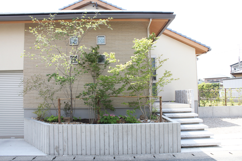 浜松市西区篠原町・K邸 2013.03.30 | アプローチオープンタイプ駐車場 Planning|設計・施工のポイント 高低差がある現場で、階段を大判の白御影石を浮かし、陰影を印象的に見せました。ポーチの転落防止には通常の手摺は使わずに、アプローチの白御影石と合わせて棒状の石を連続的に並べています。道路側は建物の深基礎が目立たないように土留めをし、植栽で顔を作りました。土留めには、RC打放しに立てのラインの模様を入れおもしろさを出しています。 浜松市東区白鳥町・H邸 浜松市南区高塚町・S邸 他の記事を見る 掛川市 外構|建物と調和したカーポート 2021.10.11 | アプローチオープンタイプカーポート雑木雑木の庭駐車場 浜松市浜北区外構・雑木の庭|五感を刺激する表情ゆたかなアプローチ 2020.08.28 | アプローチオープンタイプ雑木の庭 浜松市南区高塚町・S邸 2013.03.30 | アプローチオープンタイプ駐車場 タグ一覧 アプローチオープンタイプ駐車場