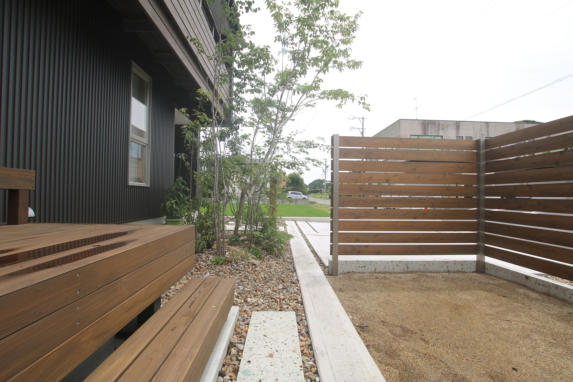 掛川市外構・雑木の庭|建物のファサードと呼応するウッドフェンス 2020.07.21 | ウッドフェンスオープンタイプ雑木の庭駐車場 Planning|設計・施工のポイント 建物のファサードに合わせ、外構でも目隠しフェンスにはウッドフェンスを、門柱は木製柱を建てて調和を考えました。 また、2階にいても緑が感じられるように植栽の配置とボリュームに配慮し、緑に包まれる建物を演出しました。 駐車スペースはメインは土間コンクリート、サブは砂利敷きにすることでメリハリをつけています。細い帯のコンクリートが敷地全体に繋がり、広々と感じられます。 磐田市外構・雑木の庭|高低差のある敷地で石積み植栽 静岡市雑木の庭|街路に面した緑のアプローチ 他の記事を見る 静岡市 外構・雑木の庭|水辺の上のアプローチ 2020.10.05 | アプローチ石雑木雑木の庭駐車場 浜松市浜北区外構雑木の庭|雑木が主役 2015.11.27 | 掛川市外構・雑木の庭|建物のファサードと呼応するウッドフェンス 2020.07.21 | ウッドフェンスオープンタイプ雑木の庭駐車場 タグ一覧 ウッドフェンスオープンタイプ雑木の庭駐車場