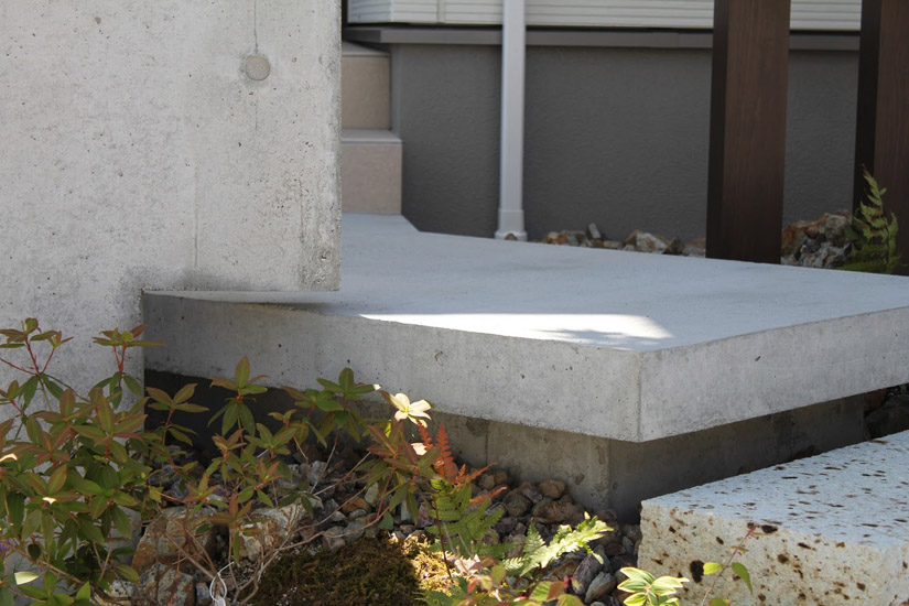 階段も一つの見せ場になってきます。ここでは、大谷石の階段とコンクリートを張出すようにして陰影を付けてデザインしました。門袖は玄関ドア前に配置することで、玄関ドアを開けた時に直接中が見えなくなります。アプローチは、高低差が少ない方に斜めに振ると階段が少なくなりコストもおさえられます。あとは、空いたスペースに植栽を配置すると緑の間を抜けていく気持ち良い空間ができてきます。
